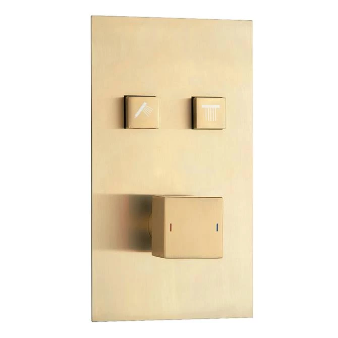 The wall mounted modern Arezzo brushed brass push-button operated shower valve features instant start/stop activation control for 2 outlets and a stunning minimalist design. Offers thermostatic showering via easy-to-operate controls, the square handle controls temperature and the push-buttons operate two shower accessories.