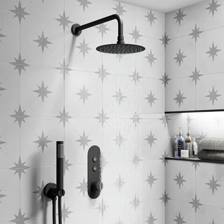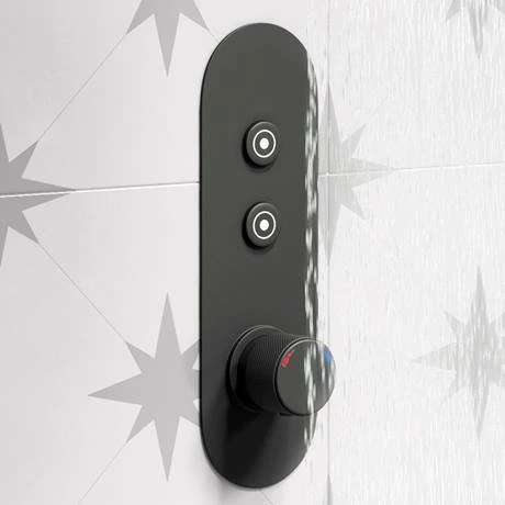 The stylish Arezzo industrial-style matt black 1 touch push button smart control shower valve is perfect for adding a striking finishing touch to your contemporary bathroom. Features easy to use instant 1 touch push button start/stop water flow activation. Temperature and flow is easily adjusted by simply turning the mixing valve. Crafted to the highest standards, this stunning shower valve features a round knurled textured tap head controls, perfect for creating an eye catching industrial look in your bathroom. Plated in a matt black finish which is highly resistant to corrosion. This ‘twin’ shower valve is perfect for installing in a concealed arrangement, valve diverts between two shower accessories: fixed head/slide rail kit, fixed head/body jets or slide rail kit/body jets.