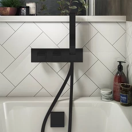 The eye-catching square Arezzo matt black modern concealed thermostatic control shower valve has been fitted with a handy shower handset. You can also rest assured the clever thermostatic shower valve will always keep your water at a safe temperature. Features minimalist square handles, this modern style shower valve is perfect for installing in a concealed arrangement. Diverts between two outlets.