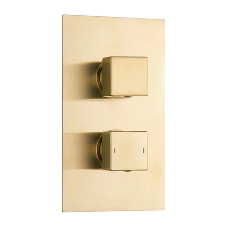 The Arezzo Concealed Thermostatic Shower Valve with Diverter features a striking geometric design with a contemporary brushed brass finish. Offers thermostatic showering via two easy-to-operate controls for temperature and flow. Designed to control two outlets e.g. fixed head/slide rail kit, fixed head/body jets or slide rail kit/body jets.