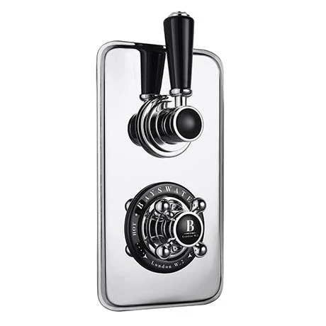 The Bayswater Black Twin Concealed Thermostatic Shower Valve with Diverter combines the elegance of traditional styling with the precision and technology of modern day design. Manufactured from solid brass and beautifully finished in chrome to the highest quality. The shower valve can be used on all types of water systems and offers full thermal protection to prevent scalding in the event of hot or cold water shut off. The built-in diverter allows 2 outlets to be used one at a time.