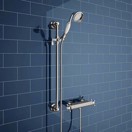 The Chatsworth exposed thermostatic bar valve with bottom outlet is part of our traditional collection of bathroom products. Classic styling with a chrome finish and constructed from solid brass, the Chatsworth bar valve has two cross-head tap head controls with classic white indices, one controls the flow and the other controls the temperature. Featuring the latest anti-scald technology, the valve is pre-set to a safe and optimal 38°C, this can be easily offset by holding down the safety push and click button on the handle. Designed to be used with a slider rail kit (not included).