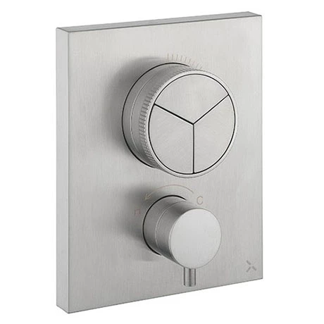 Three outlet CROSSBOX showers allow water delivery from any one of 3 outlets. If you want a quicker and easier way to install a shower valve that projects less, choose CROSSBOX. Trim sets include flow control, thermostat, backplate and handles.