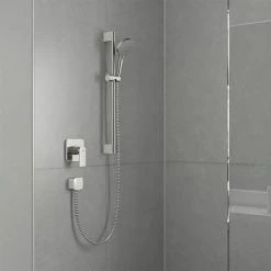 A pack of 2 x complete showers for large or commercial projects. The Vernis Shape Showerpipe 230 Thermostatic Shower Mixer combines a hand and overhead shower, as well as a thermostat, into one product. It features a large 230 x 170mm rectangular shower head and shower handset with a height-adjustable shower holder that can also be turned and tilted. The self-locking slider can be operated with one hand. It’s Rain spray is perfect for rinsing shampoo out of your hair while the QuickClean rub clean nubs loosens any limescale deposits making sure your hand shower looks beautiful, and stays working for longer.