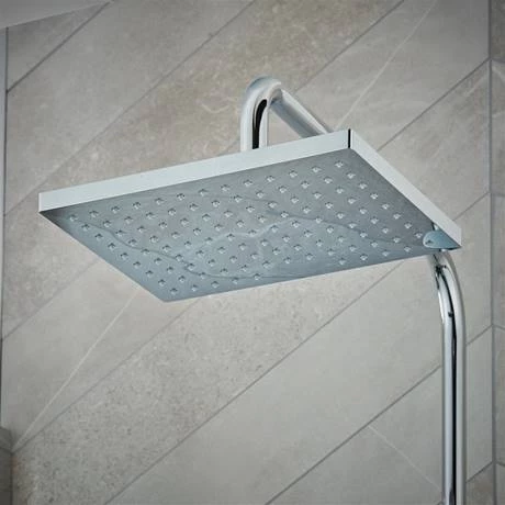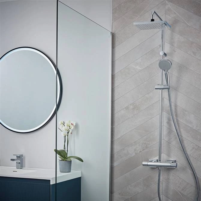 The Vernis Shape Green Showerpipe 230 Thermostatic Shower Mixer combines a hand and overhead shower, as well as a thermostat, into one product. This Green model reduces water consumption down to just 5.7 litres per minute. It features a large 230mm shower head and shower handset with a height-adjustable shower holder that can also be turned and tilted. The self-locking slider can be operated with one hand. It’s Rain spray is perfect for rinsing shampoo out of your hair while the QuickClean rub clean nubs loosens any limescale deposits making sure your hand shower looks beautiful, and stays working for longer.