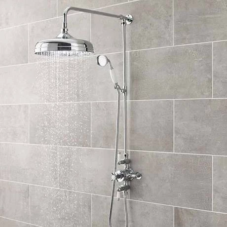 The Nuie traditional range of exposed thermostatic shower valves brings substantial elegance to the modern bathroom. This exposed Thermostatic Triple Shower Valve offers thermostatic showering via three easy-to-operate controls.